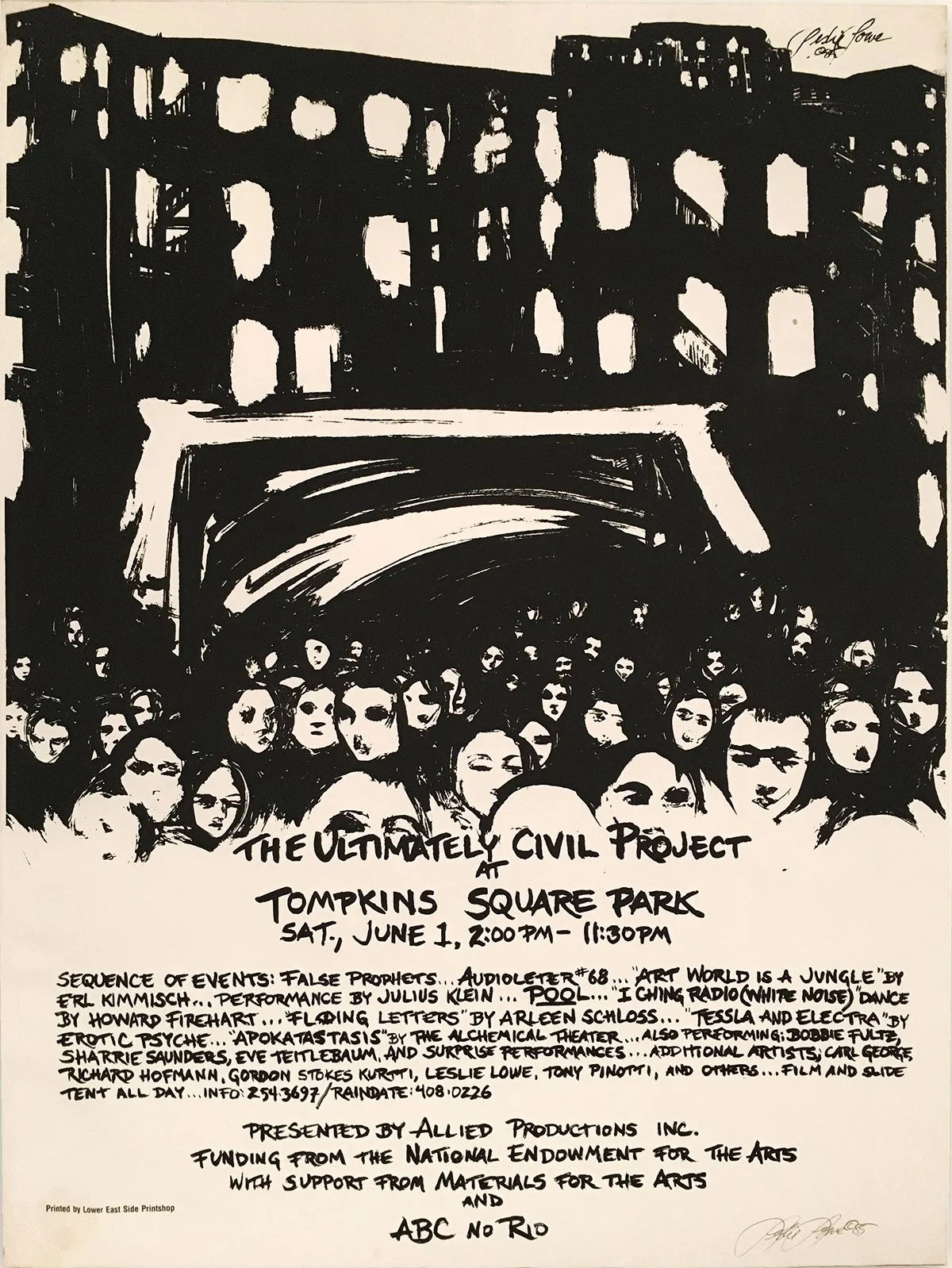 Allied Productions, Inc. was formed near the end of the 20th century following an era of significant social reform. We were nevertheless conflicted by a cultural mainstream whose institutions move slowly in resistance to progressive change. Through the art we foment, and in our cultural production, Allied navigates the curves and edges where traditional institutional support not only fails, but can often be a barrier against actual creative evolution. In its early years Allied Productions was the parent organization of ABC No Rio. Two of Allied’s co-founders, Peter Cramer and Jack Waters, simultaneously co-directed No Rio and subsequently guided No Rio to its autonomy as a non-profit organization. As we turn our focus on the preservation of our own collections and archives, Allied remains the principal arbiter and consultant for the archives of No Rio’s formative period.